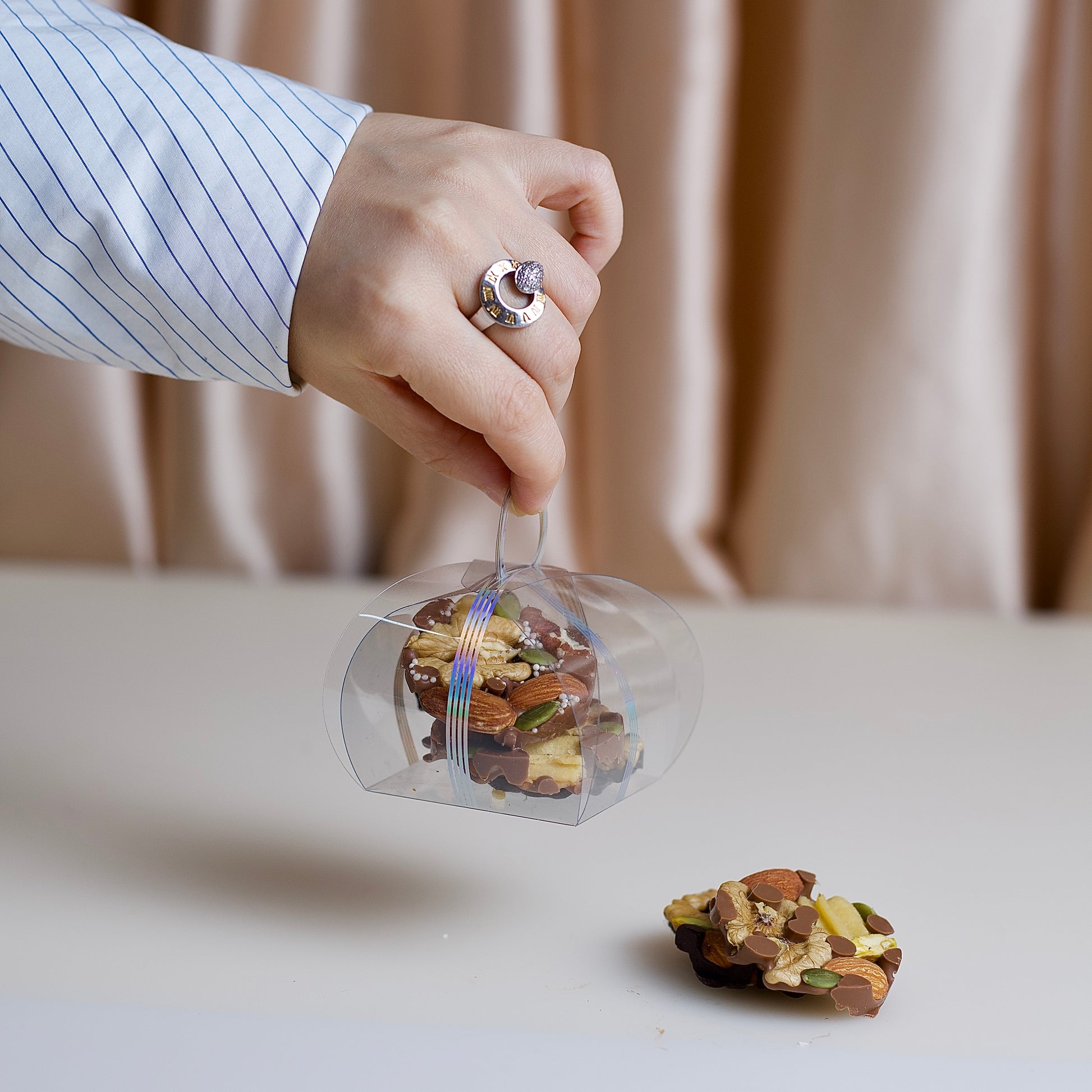 Handcrafted chocolate discs topped with premium nuts, elegantly finished with artisanal care to create a refined and thoughtful delight.